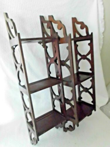 Title (ebay affiliate link): 2 ANTIQUE WOOD 3 TIER SHELVES, CUT-OUT WORK SIDES, TALL, 25 1/2", NARROW