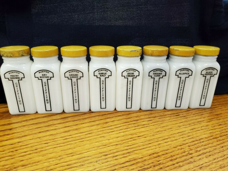 VINTAGE - MILK GLASS GRIFFITH''S SPICE JARS - LOT OF 8