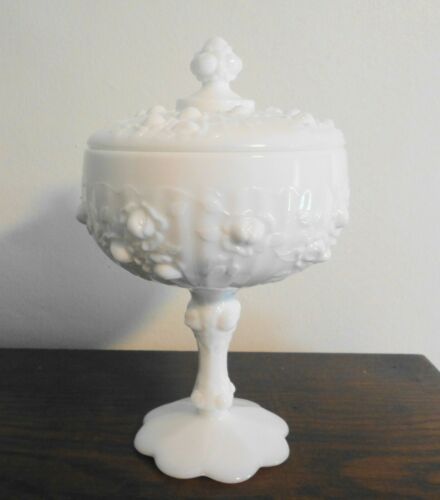 Title (ebay affiliate link): Fenton Milk Glass Rose Pattern Covered Candy Box with Lid YOP 1967
