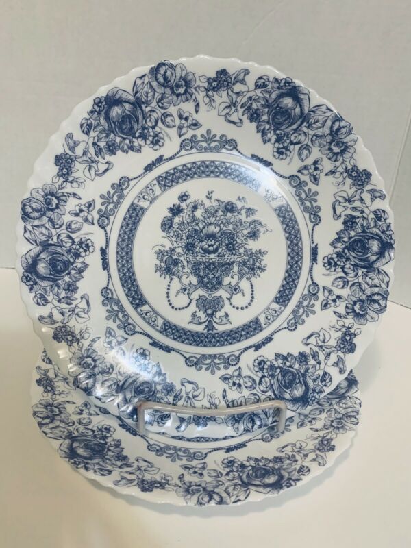 2 Arcopal HONORINE Milk Glass France Scalloped Blue White Dinner Plates