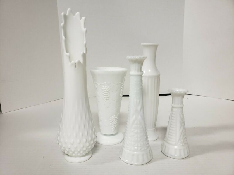 LOT OF 5 WHITE MILK GLASS VASES WEDDING FARMHOUSE flower bud vase decor