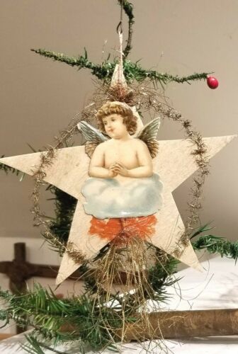 Title (ebay affiliate link): Raphael Angel in Crepe Paper Star, Cellophane, Tinsel & Paper Ornament. German