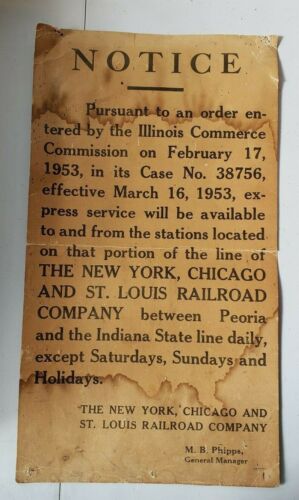 Title (ebay affiliate link): VINTAGE 1953 RAILROAD NOTICE CARDBOARD ADVERTISING SIGN NEW YORK CHICAGO