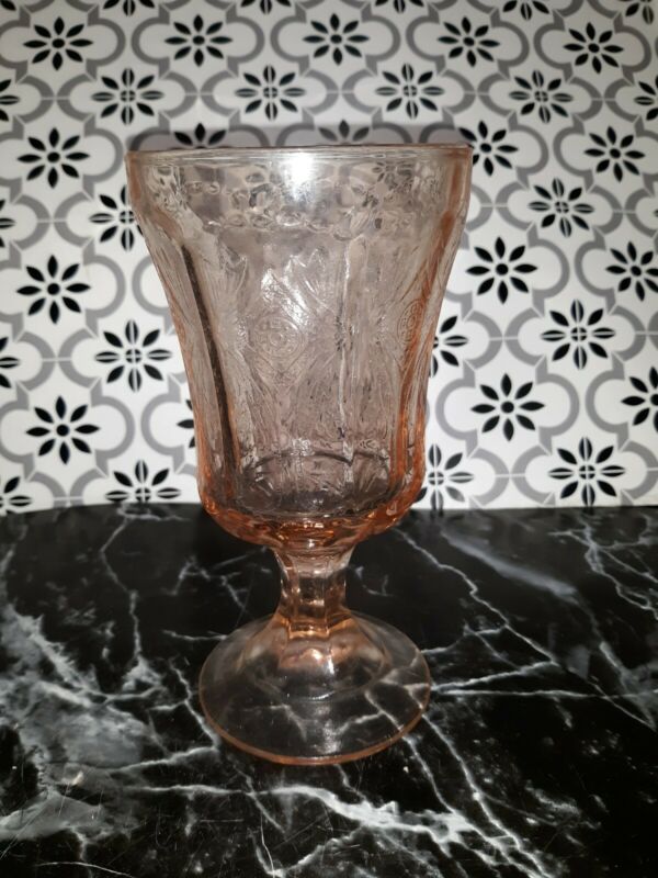 Title (ebay affiliate link): Indiana Glass Recollection (Madrid) Pattern Pink Goblet footed depression