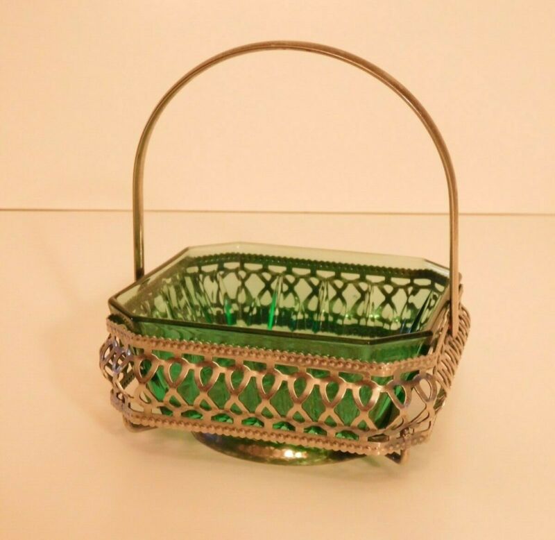 Title (ebay affiliate link): art deco vintage green vaseline glass basket relish dish, ornate metal frames