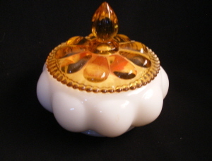 White Milk Glass Powder Box w/Amber Glass Lid