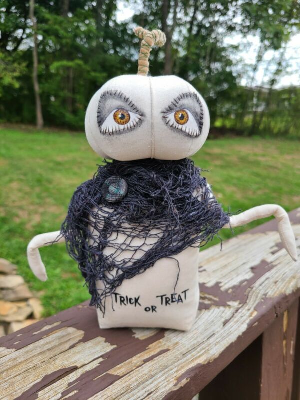 Title (ebay affiliate link): Pumpkin Head White trick or treat Halloween Primitive Doll Fall Folk Art stump