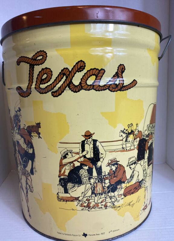 Vintage Texas Western Tin 5th Ed. Panhandle Popcorn Co. Chuck Wagon Sam Houston