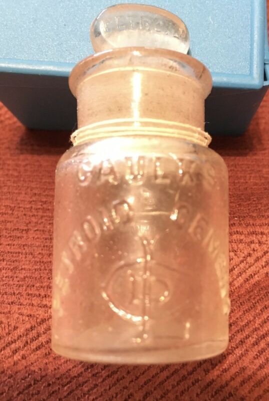 Title (ebay affiliate link): Antique Dental Bottle: Caulk Petroid Cement, Embossed w/Glass Stopper.