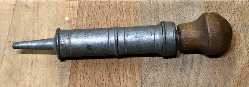 Antique Primitive Small Pewter Medical Syringe, Wood Plunger, c. 19th Century