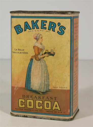 c1920 WALTER BAKER CHOCOLATE TIN PRODUCT PACKAGE 1/2 POUND BREAKFAST COCOA FULL