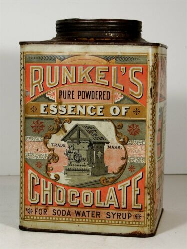 c1906 TIN LITHO RUNKELS SODA FOUNTAIN CHOCOLATE SYRUP FOR SODA AND ICE CREAM TIN