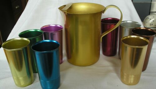 Title (ebay affiliate link): Vintage Aluminum Pitcher with Ice Lip and 8 Colored Drinking Glasses