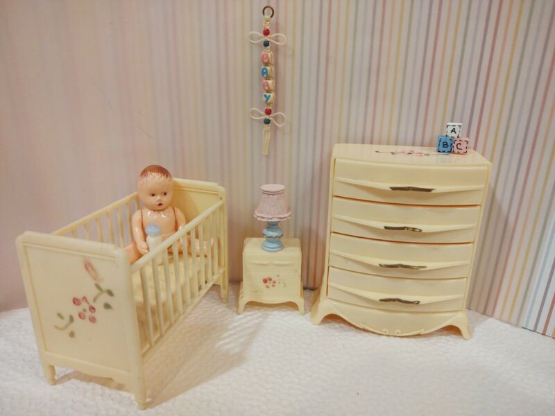 Title (ebay affiliate link): Plasco NURSERY SET OFF WHITE w/IDEAL DOLL Vintage Miniature Dollhouse Furniture