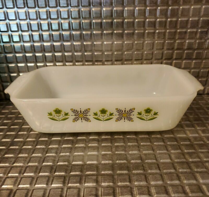 Title (ebay affiliate link): Vtg Anchor Hocking FIRE KING ~ Milk Glass BREAD PAN MEATLOAF Meadow Green L@@K