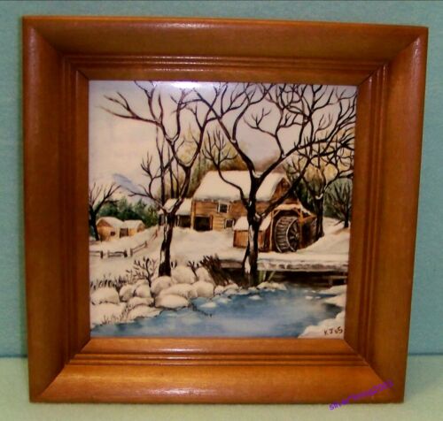 VNTG TILE WINTER PICTURE ARTIST SIGNED PORCELAIN HAND PAINTED with WOOD FRAMED