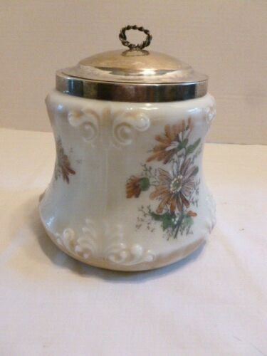 Title (ebay affiliate link): VINTAGE MILK GLASS BISCUIT JAR - HAND PAINTED FLORAL DESIGN - WITH TOP
