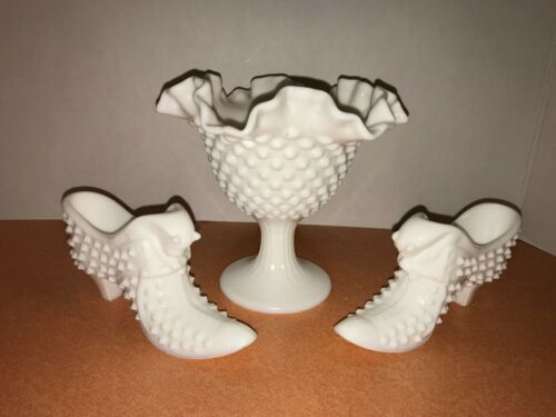 Title (ebay affiliate link): Vintage Fenton Hobnail White Milk Glass Compote & 2 Slippers Shoes Set! WOW!!