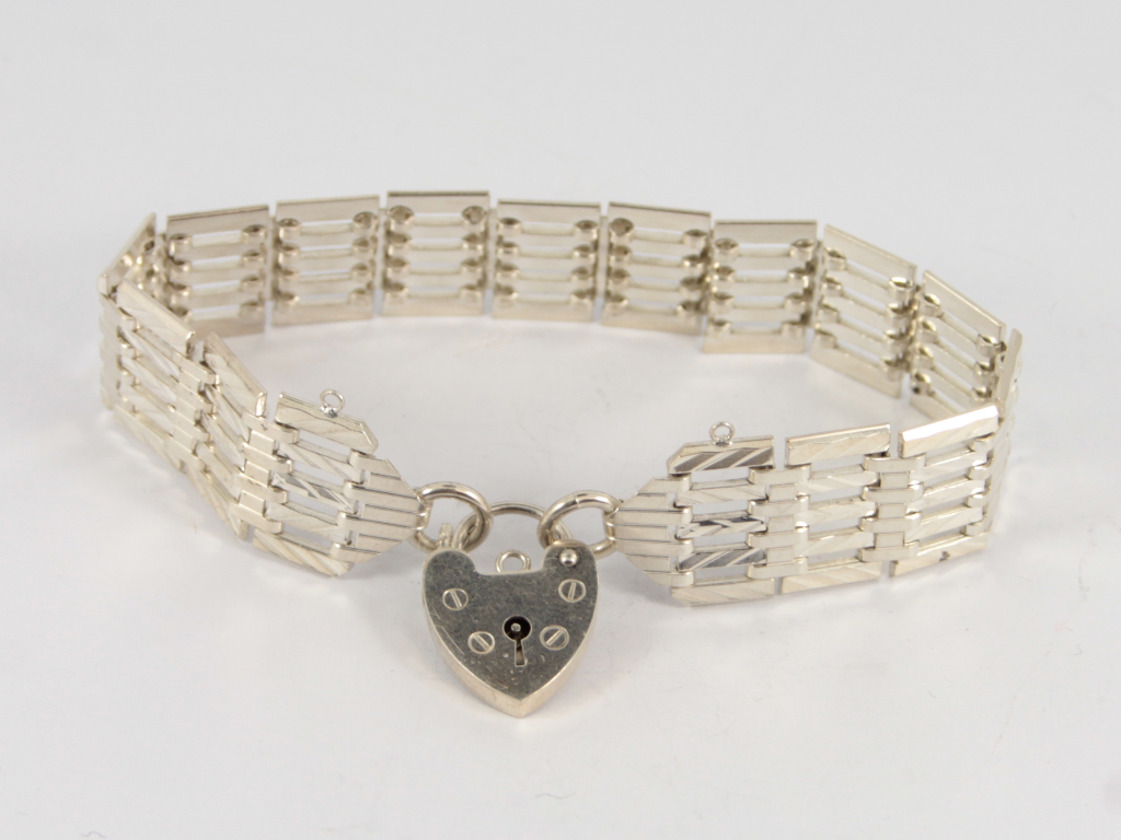 Title (ebay affiliate link): Vintage Gate Bracelet Sterling Silver Heart Padlock Clasp 925 23.4g Go65