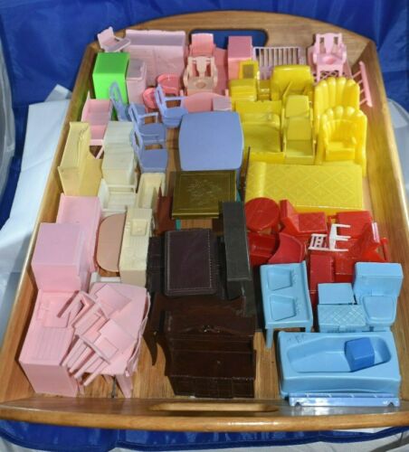 Title (ebay affiliate link): 63 VINTAGE Plastic Dollhouse FURNITURE RENWAL, MARX, PLASCO, MATTEL COLORFUL~!