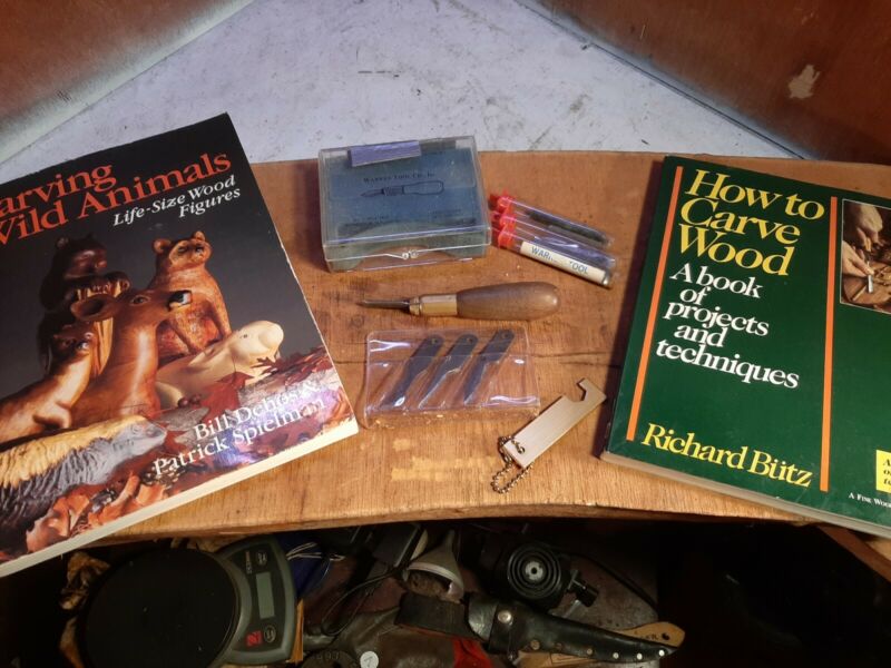 Title (ebay affiliate link): patented WARREN PA TOOL HANDLE wood carving knife chisel SET with 2 carving book