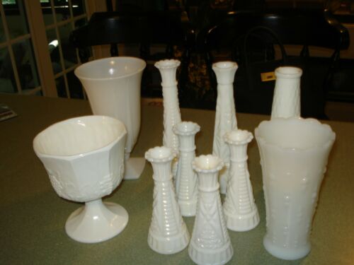 Title (ebay affiliate link): VINTAGE LOT OF 10 MILK GLASS ORIGINAL VASES SHORT AND LARGE COMPOTE