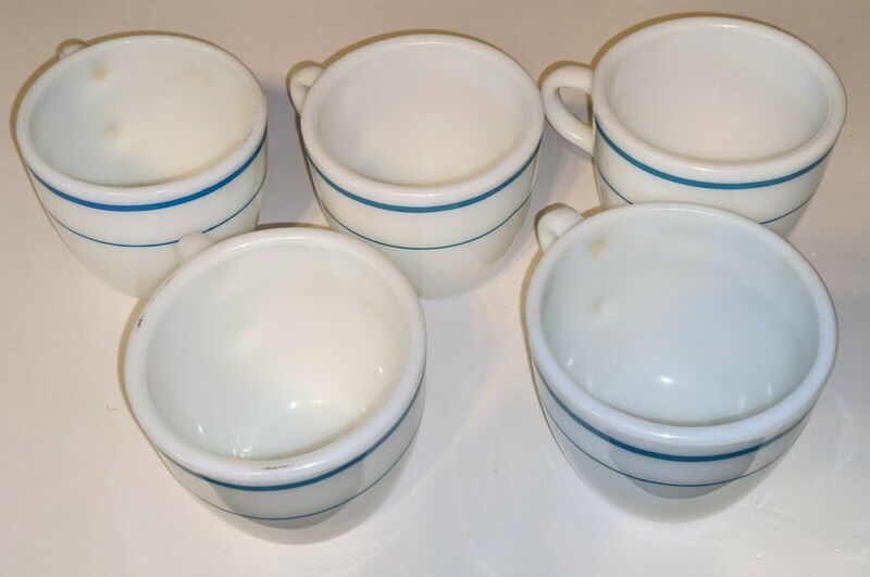 Vintage PYREX Tableware by CORNING Set of 5 Blue Stripe Milk Glass Mugs #723