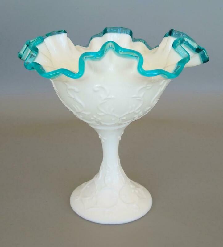 Title (ebay affiliate link): Fenton Milk Glass Aqua Crest Spanish Lace Ruffled Compote Blue White