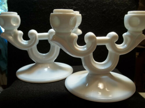 SET OF 2, VTG MILK GLASS DOUBLE-BRANCH CANDLE HOLDERS