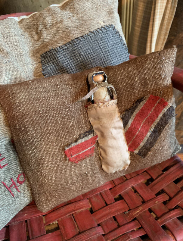 Title (ebay affiliate link): Sm Pillow Of Early Lindsey Woolsey With Patches & Pocket W/ Clothes Pin Doll