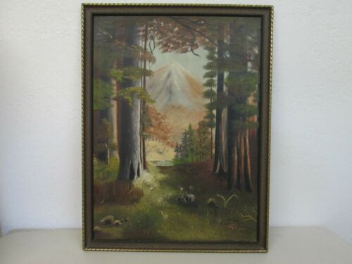 Title (ebay affiliate link): ANTIQUE EARLY AMERICANA ORIGINAL OIL ON BOARD PAINTING OF STAGS IN THE FOREST