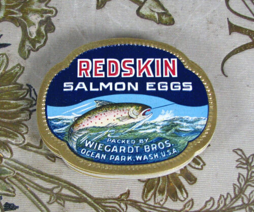 Title (ebay affiliate link): 52 fancy old REDSKIN SALMON EGGS CLUSTER jar labels OCEAN PARK WA Wiegardt