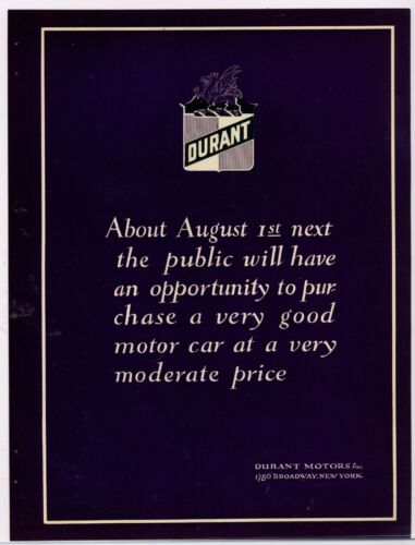 1921 Durant Motor Cars Ad on Cardstock: Intro of Nameplate. Purple Background