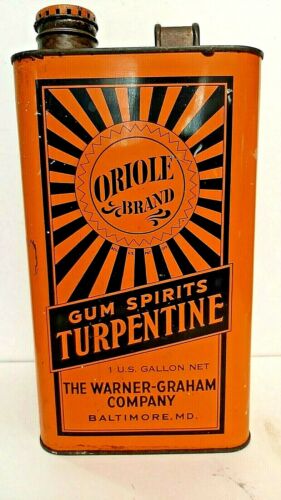 Title (ebay affiliate link): Vintage 1 Gallon ORIOLE Brand Gum Spirits Turpentine Tin Can Baltimore Maryland