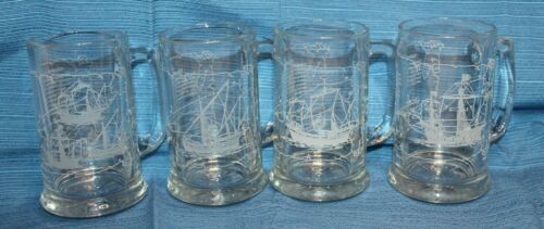 Set of 4 - Long John Silvers Columbus Voyage Glass Mugs - Nautical/Sailing/Ships