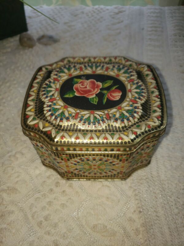 Title (ebay affiliate link): Vintage Biscuit Tin with Flower in lid center and Hammered Design