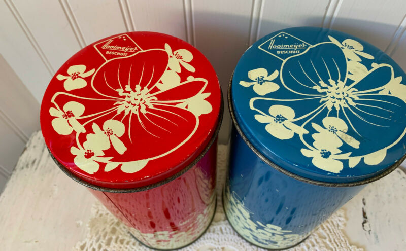 Title (ebay affiliate link): Two Vintage German Biscuit Tins HOOIMEYER BESCHUIT Red Blue Flowers Set Lot