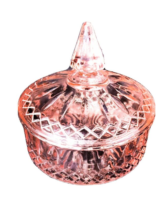 Title (ebay affiliate link): Pink Depression Cut Glass Heavy Candy Dish Bowl With Lid Vintage