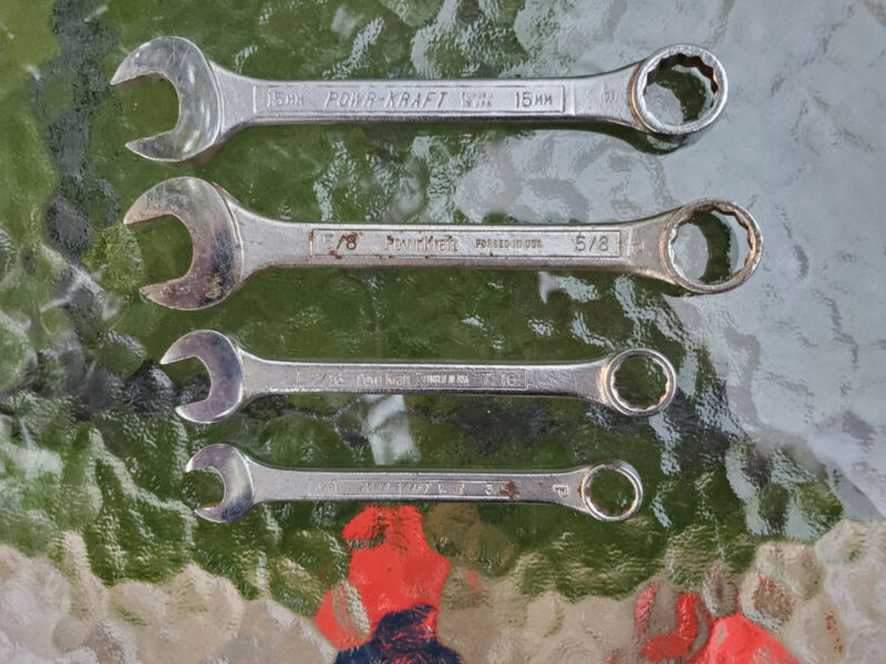 Title (ebay affiliate link): Montgomery Ward Powr-Kraft Mixed Combination Wrenches Standard & Metric USA Made
