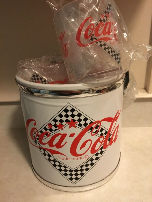 Title (ebay affiliate link): Coca Cola Trademark Ice Bucket & 4 Plastic Cups, White W/Checkered Logo, Unused