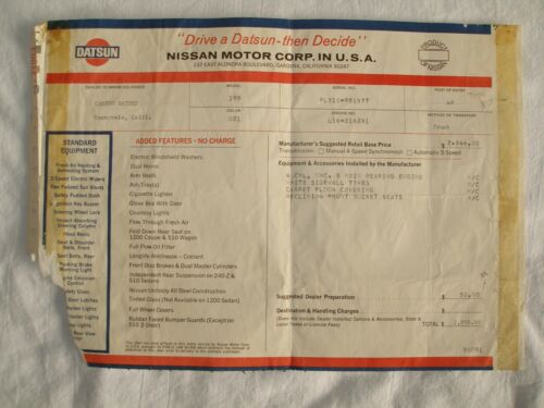 Title (ebay affiliate link): 1972 Datsun 510 Original Window Sticker Shipping Invoice