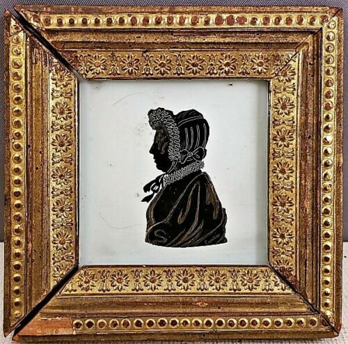 Title (ebay affiliate link): Antique REVERSE PAINTED SILHOUETTE OF WOMAN IN BONNET Small Gold Frame As Is NR
