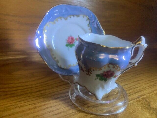 Title (ebay affiliate link): BEAUTIFUL Antique Demitasse Pink Rose w/Blue and Gold Trim Cup & Saucer BID NOW!