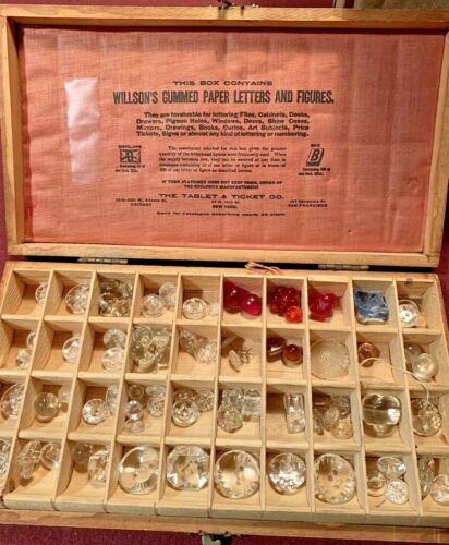Title (ebay affiliate link): Vintage Willson''s Gummed Paper Letters& Figures Wood Box w/ clear glass buttons