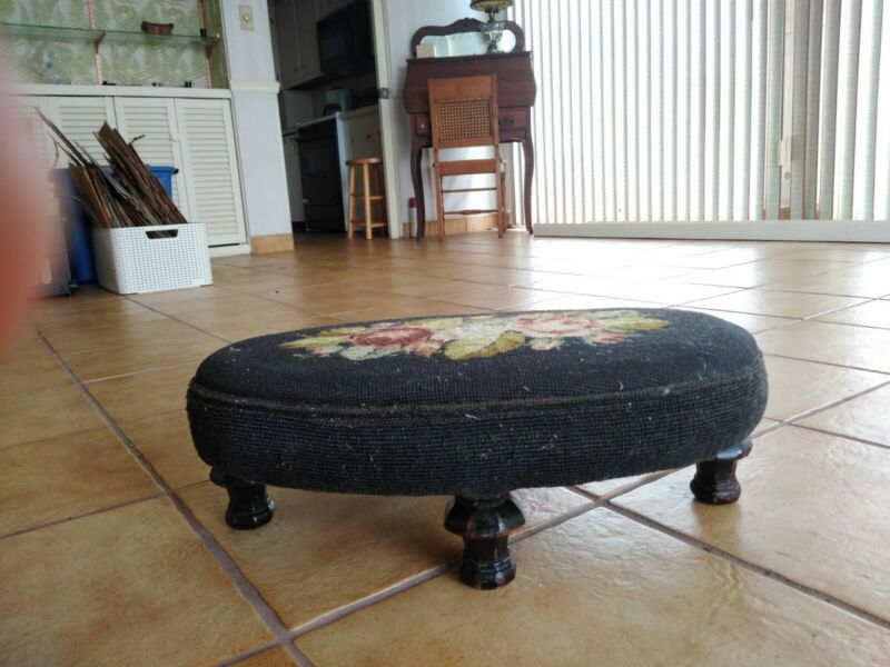 Vintage Oval Footstool Floral Black Needlepoint Empire Feet