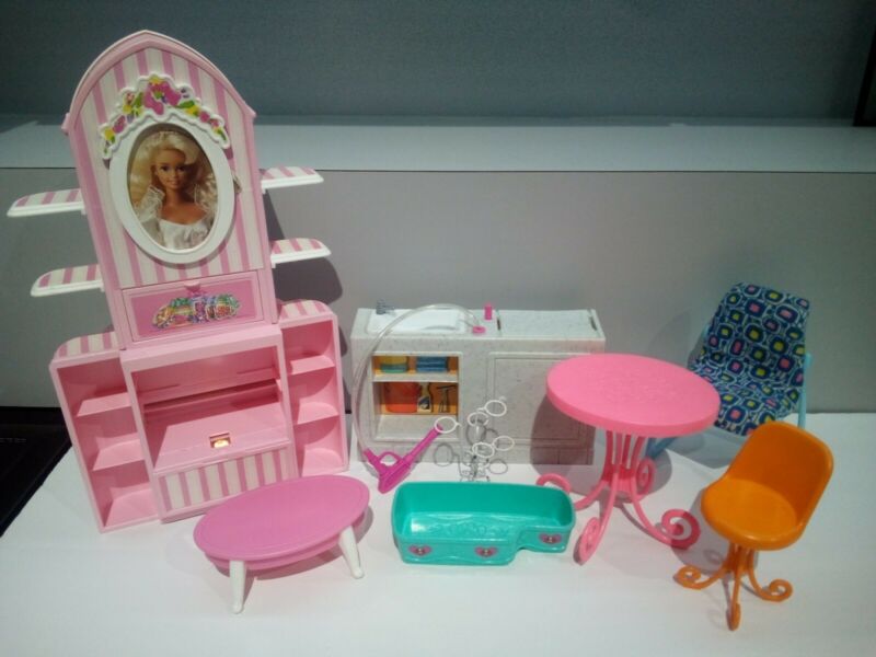 Title (ebay affiliate link): Barbie Furniture Lot Table Chairs Sink Fireplace Hutch Record Player Bookshelf