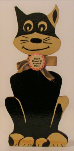 Title (ebay affiliate link): VINTAGE FOLK ART WOOD COMICAL CAT DOORSTOP w/ RIBBON & PURINA PINBACK BUTTON