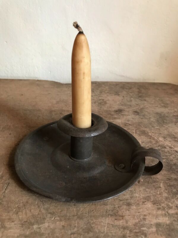 Early Antique Handmade Chamber Stick Tin Candle Holder Patina AAFA Faux Tallow