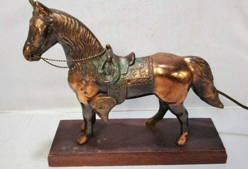 VINTAGE BRASS/ COPPER HORSE LAMP, MOUNTED ON WOOD WORKS