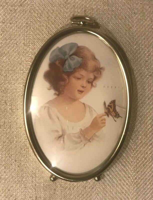 Vintage Oval Hanging Gold Metal Picture Frame With Victorian Girl Butterfly
